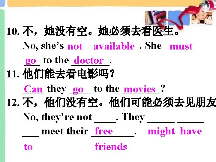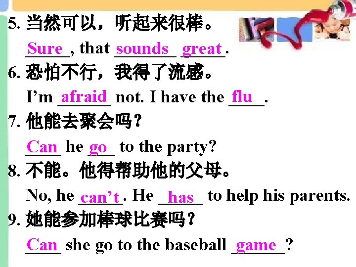 Grammar Focus Can you come to my party on Saturday? Sure, I'd love to. Sorry, I must study for a math test. Can you go to the movies tomorrow night? Sure. That sounds great. I'm afraid not. I have the flu. Can he go to the party? No, he can't. He has to help his parents. Can she go to the baseball game? No, she's not available. She must go to the doctor. Can they go to the movies? No, they're not free. They might have to meet their friends.