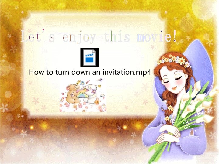 How to turn down an invitation • I’m sorry, I can’t. I have to… • I’d love to, but I have to… • Sorry, I can’t. I’m going to the movies. • Thanks for your invitation. • Thank you for asking me. Do you know? Conclusions: