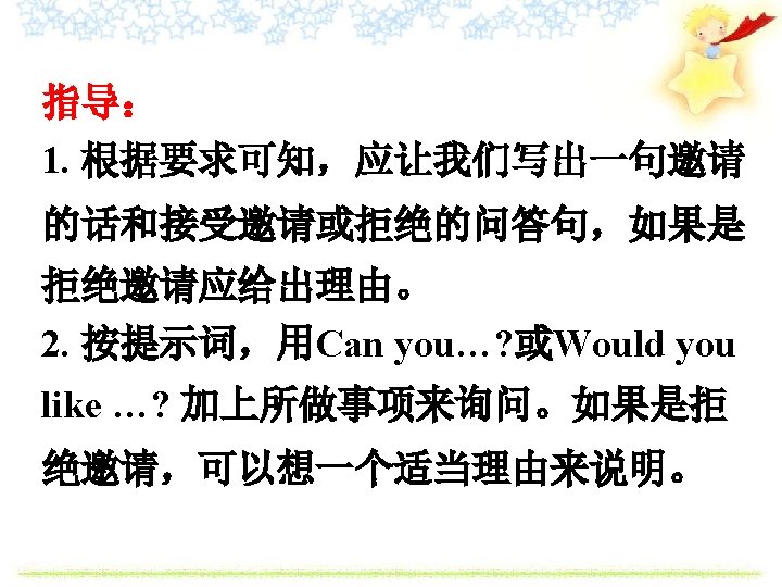 Do you know these new words? 1. invite v. 邀请 e. g. I’d like to invite you to dinner. 我想邀请你吃晚饭。 2. accept v. 接受 e. g. They didn’t accept his money. 他们没有接受他的钱。 3. refuse v. 拒绝 e. g. The girl refused his invitation. 女孩拒绝了他的邀请。
