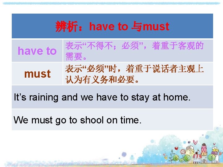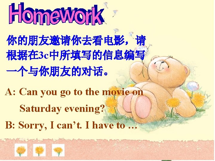 Can you come to my party on Saturday afternoon? I’m sorry. I must practice the violin on Saturday afternoon. I’m afraid not. I have the flu. I’m sorry. I have to stay at home to help my mum.
