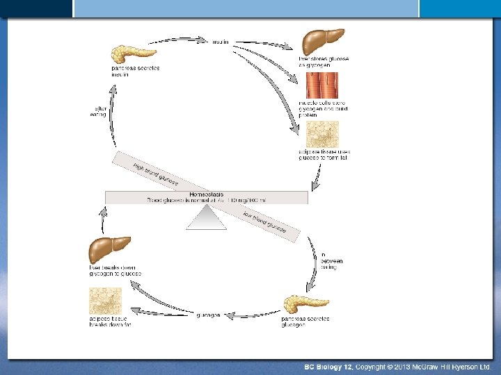UNIT B Chapter 9: Digestive System Section 9. 2 Islets of Langerhans secrete hormones Insulin • Hormone secreted when blood glucose level is high • Stimulates the uptake of glucose by cells (liver, muscle, adipose tissue) to lower blood glucose Glucagon • Hormone secreted when blood glucose level is low • Stimulates the liver to break glycogen down into glucose to increase blood glucose • Stimulates adipose tissue to break fat down to glycerol and fatty acids (to make glucose) TO PREVIOUS SLIDE