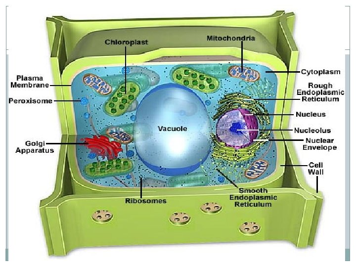 Practice problem �Name five differences between plant and animal cells. plants have cells walls plants store energy as starches and oils, animals as glycogen or fats plant cells have a large central vacuole animal cells have more mitochondria because their energy needs are higher Plant cells have chloroplasts & chlorophyll