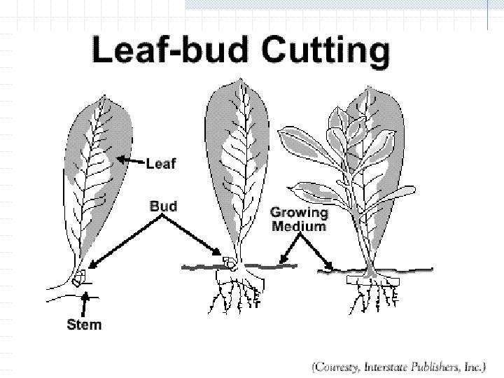 Leaf-bud cutting The stem is treated with a rooting hormone and inserted into the growing medium with the lateral bud just below the medium surface The new plant will develop from the lateral bud.