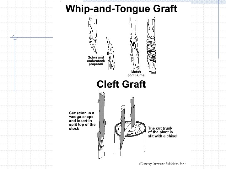 Cleft graft - joins small scion to larger rootstook; usually done in winter.