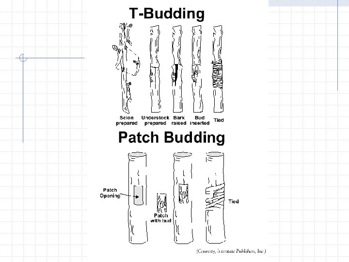 Budding Is similar to grafting except that the scion is reduced to a single bud. There are two common methods of budding: n n T-Budding Patch Budding