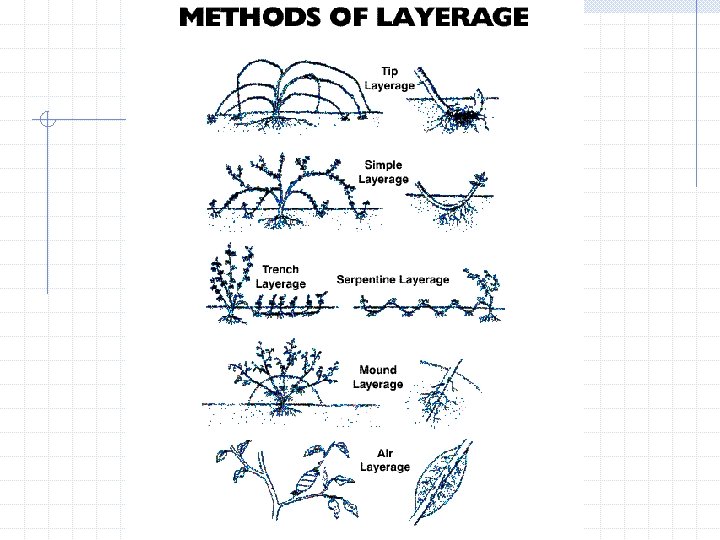 Types of layering Simple layering - branches are bent to the ground and portions of branches are covered with soil. The terminal ends are left exposed. The covered portion must have a bud or buds and must be injured - roots should form in this area.