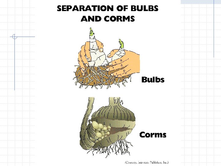Division Method in which parts of plants are cut into sections that will grow naturally into new plants. Plant structures that can be separated or divided include: bulbs n corms n rhizomes and tubers n plant crowns n