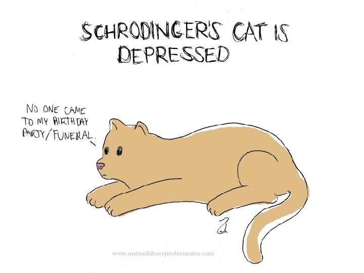 Schrödinger's Cat • An Austrian Scientist named Erwin Schrödinger devised a thought experiment to poke fun of the Heisenberg theorem in which a cat was placed in a giant box with a poison bomb with a 50/50 chance of detonating • According to the Uncertainty Principle, the cat was both alive and dead • This became known as Schrödinger's Cat