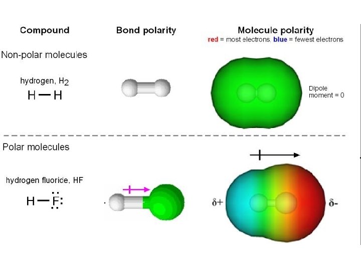 Polar Molecules • If one element is significantly more electronegative than the other, a polar covalent bond is formed • Atoms share electrons unevenly, resulting in one side which is slightly positive and one that is negative • Polar molecules can mix with water; non-polar (hydrophobic) molecules can not