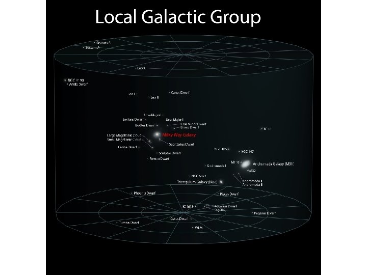 Il gruppo locale è costituito di una cinquantina di galassie la maggior parte delle quali è satellite della Via Lattea o della Galassia di Andromeda Nel Gruppo Locale ci sono molte galassie irregolari e nane poco massicce (M=107 M )