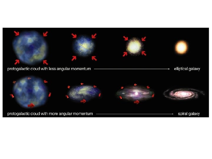 oggi 5 Gyr fa 7 Gyr fa • La frazione di E/S 0 rimane abbastanza costante al crescere di z (= si formano a alto z) • La frazione di S/Ir decresce al crescere di z (= le S non si sono ancora formate 7 Gyr fa) • La frazione di galassie peculiari cresce al crescere di z (= galassie in interazione, le galassie grandi si formano assemblando galassie piccole)