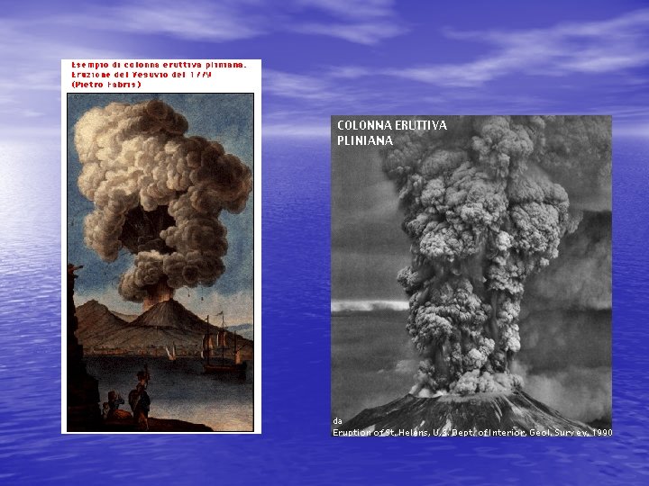 PRIMA FASE ERUTTIVA: colonna pliniana • L'eruzione del Vesuvio del 79 d. C. • inizia intorno all'una del pomeriggio del 24 agosto con la formazione di un'alta colonna di gas, cenere e lapilli, così descritta da Plinio: La nube (. . . ) a forma di pino, si sollevava alta nel cielo e si dilatava come emettendo rami Plinio, da Miseno (21 km dal vulcano), può osservare la colonna eruttiva in tutto il suo sviluppo. La sua descrizione è tanto efficace che il termine pliniano viene utilizzato nella vulcanologia moderna per indicare una fase eruttiva durante la quale si forma una colonna sostenuta, formata da una miscela di cenere, pomici e gas.