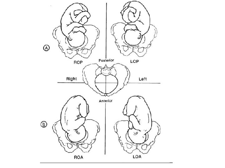 • • Position: Position refers to the location of a fixed reference point on the fetal presenting part in relation to a specific quadrant of the maternal pelvis. The presenting part can be right anterior, left anterior, right posterior, and left posterior. These four quadrants designate whether the presenting part is directed toward the front, back, right, or left of the passageway. It is the relationship of landmark on the fetal presenting part to the front (anterior = A) back (posterior = P) or side (transverse = T) of the mothers pelvis. Landmarks on the fetal presenting parts include head = occiput (O) buttocks = sacrum (S), shoulder = scapula or acromion (A), face = chin of mentum (M). • Example: a fetus presenting by the vertex with his occipit on the left anterior part of the woman’s pelvis would have his presentation and position described as LOA or lift occiput anterior.