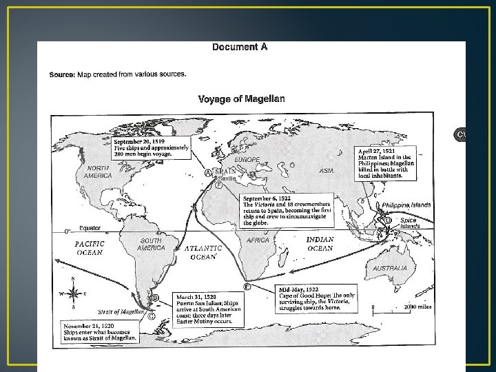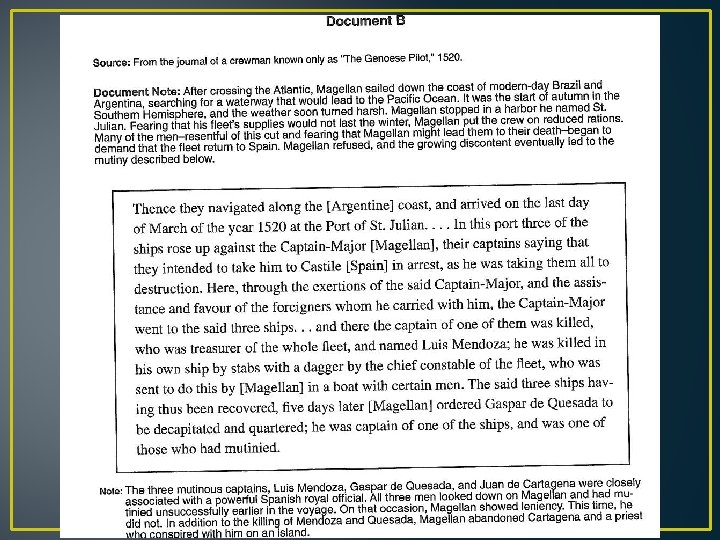 Work Session • 30 minutes – Multiple Choice • When you finish, turn in your hard copy of the test and your scantron to the designated area. • You may then get out your documents in preparation for the DBQ. • 45 minutes – DBQ • You will use the allotted time to complete your DBQ on the following question: Was Magellan Worth Defending: • Reminders: • Use your paper provided in your packet. • Remember to use all of the documents (you must use at least 4 to receive full credit) • Remember to analyze the documents, not just list them • Cite documents like this: • Luis Mendoza was decapitated and quartered during the Easter Mutiny (Document B). • Not like this: • Document B said that Luis Mendoza was decapitated and quartered during the Easter Mutiny. • Try not to use direct quotes, paraphrase, but if you do, you MUST USE If you finish with your DBQ, place your packet in the basket and pick up a QUOTES. vocabulary sheet for the next unit.