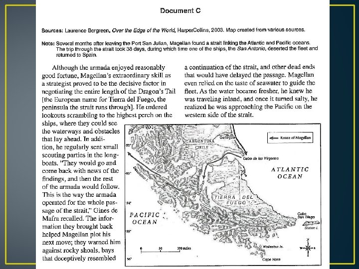 Last Ten • HW: • Complete Documents D and E over the weekend. • Complete “Getting Ready to Write” Bucketing – You will develop 3 reasons for defending/not defending Magellan. In your buckets place the letter of the document you will use to defend your statement. • Thesis Road Map – Use the “chicken foot” to develop a clear and analytical thesis • You may also develop an outline, but you will be required to write the essay in class on Monday. DO NOT WRITE ON YOUR LINED PAPER! • Also, review for the MC section of your test with your study guide I provided.