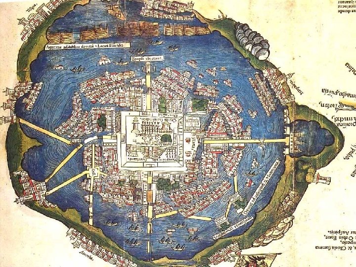 Aztec Capital • Tenochtitlan –great capital city of the Aztecs built in the middle of a lake. Held 300, 000 people with canals for streets. • Aqueducts brought water to the city • Hundreds of pyramids to different gods. Some coated in gold! • Where present day Mexico City is