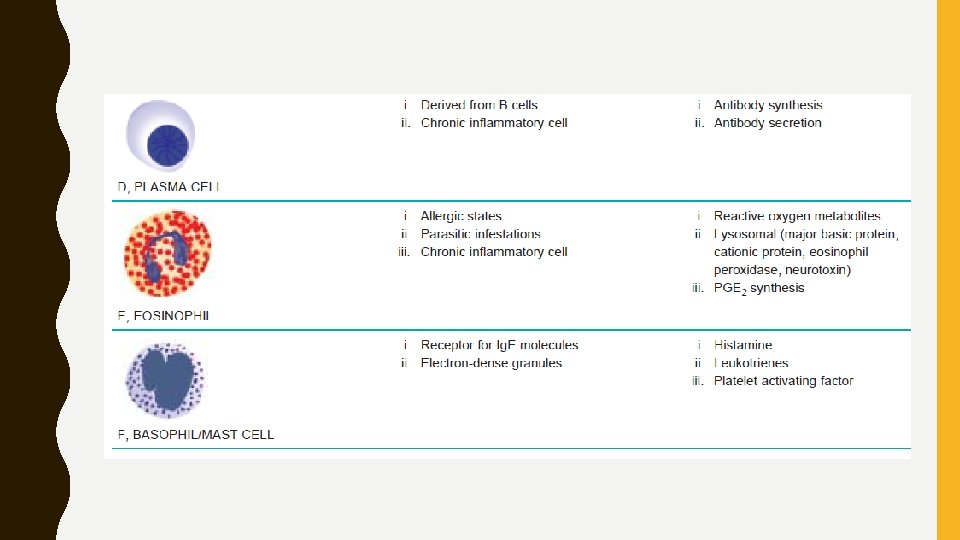 3. Basophils (Mast Cells) • Basophils comprise about 1% of circulating leucocytes and are morphologically and pharmacologically similar to mast cells of tissue. • Contains coarse basophilic granules in cytoplasm and a polymorphonuclear nucleus • Granules: Contain heparin and histamine • Basophils and mast cells have receptors for Ig. E • Degranulate on cross-linking with antigen • The role of these cells in inflammation are: i. In immediate and delayed type of hypersensitivity reactions ii. Release of histamine by Ig. E-sensitised basophils