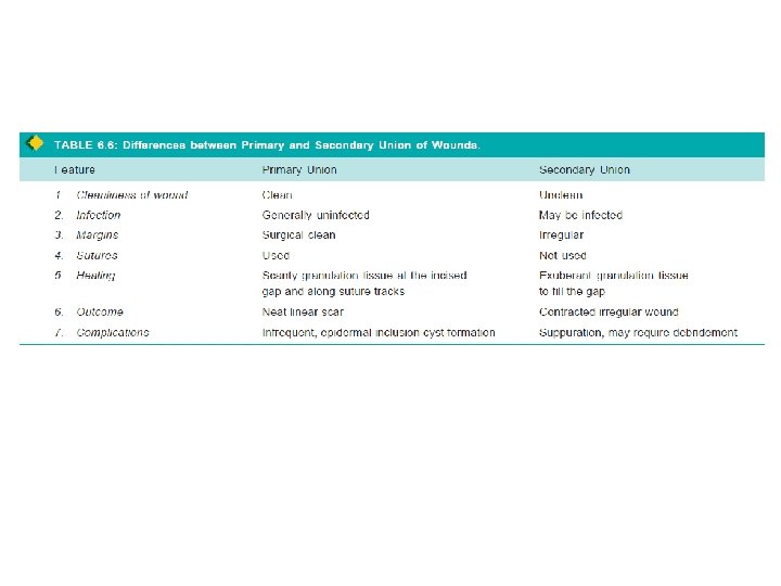 Healing by First Intention (Primary Union) • This is defined as healing of a wound which has the following characteristics: i. clean and uninfected; ii. surgically incised; iii. without much loss of cells and tissue; and iv. edges of wound are approximated by surgical sutures. The sequence of events in primary union is described below: 1. Initial haemorrhage. Immediately after injury, space between surfaces of incised wound is filled with blood- then clots and seals wound against dehydration and infection. 2. Acute inflammatory response. This occurs within 24 hours with appearance of polymorphs from margins of incision. By 3 rd day, polymorphs are replaced by macrophages.
