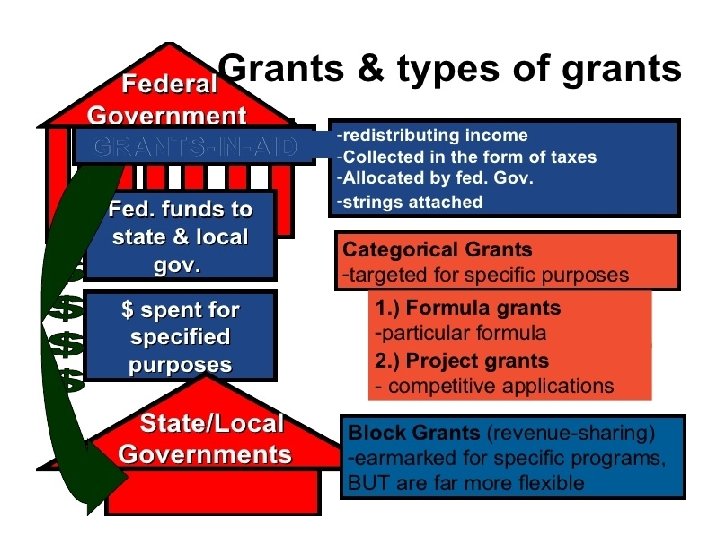 Types of Categorical Grants • Formula: $ granted is based on a mathematical formula (need, effort, population), narrow scope of spending • Project: $ granted is based upon the completion of a project (research, building, etc…)
