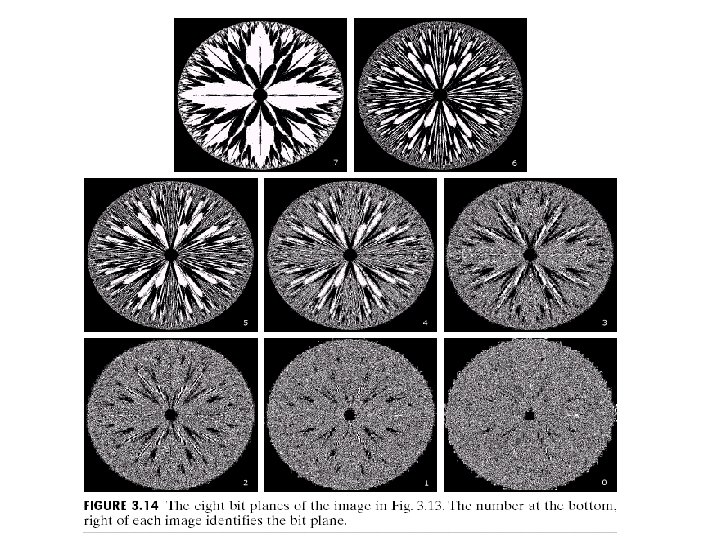 Bit-Plane Slicing • To highlight the contribution made to the total image appearance by specific bits. – i. e. Assuming that each pixel is represented by 8 bits, the image is composed of 8 1 -bit planes. – Plane 0 contains the least significant bit and plane 7 contains the most significant bit. – Only the higher order bits (top four) contain visually significant data. The other bit planes contribute the more subtle details.