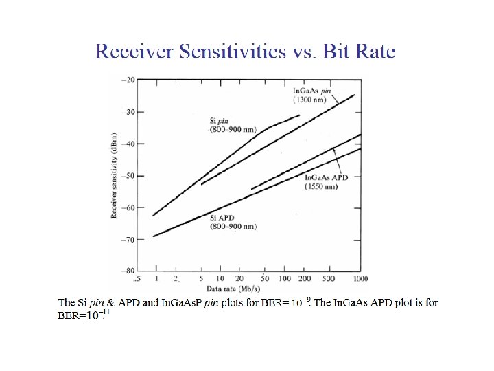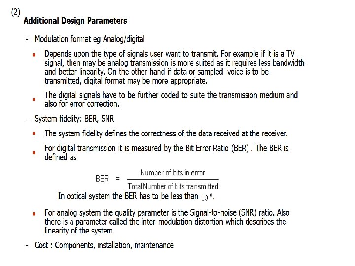 Point-to-Point Links Key system requirements needed to analyze optical fiber links: 1. The desired (or possible) transmission distance 2. The data rate or channel bandwidth 3. The desired bit-error rate (BER) LED or laser (a) Emission wavelength (b) Spectral line width (c) Output power (d) Effective radiating area (e) Emission pattern MMF or SMF (a) Core size (b) Core index profile (c) BW or dispersion (d) Attenuation (e) NA or MFD pin or APD (a) Responsivity (b) Operating λ (c) Speed (d) Sensitivity
