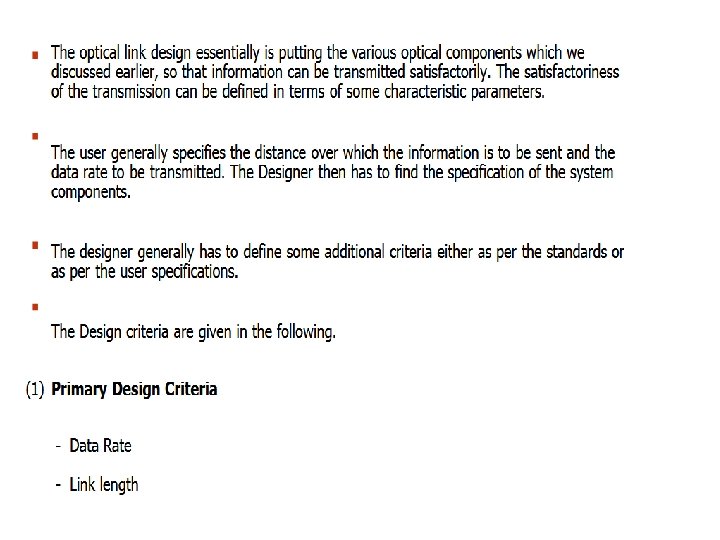 Design Considerations • Link Power Budget – There is enough power margin in the system to meet the given BER • Rise Time Budget – Each element of the link is fast enough to meet the given bit rate These two budgets give necessary conditions for satisfactory operation