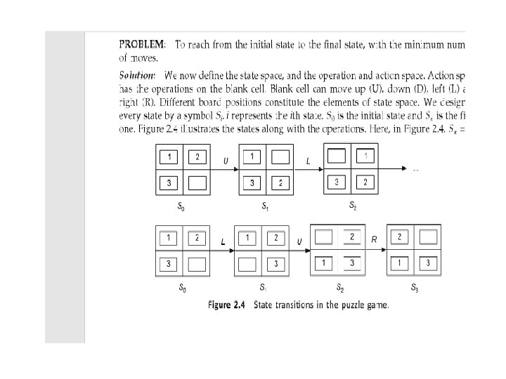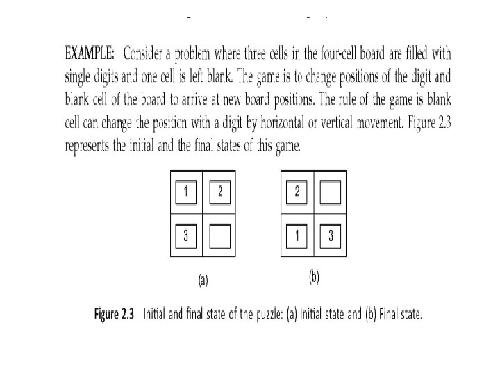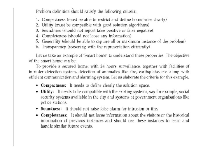 • The word problem encompasses computational tasks also • Ex solving a quadratic equation, then the process involves computation to arrive at a solution • But in AI problem is formulated and solved by searching for a solution in space of possible solution • So in AI we can define the problem as • 1. every problem is defined in a context, it has certain assumptions under initial conditions • 2. Every problem has well defined objectives • 3. solution to every problem consists of a set of activities. Each activity changes the state of problem that is from the present state to the new state • This new state is closer to the solution state • Finally initial state approaches the goal situation