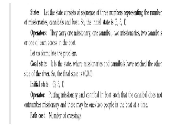• First steps to solve the problem is to find out the operators that involve taking one or two people from one side to another in the boat • A state represent the time when missionaries and cannibals are in the boat or on the other side • Bcoz boat can hold only two people, there is no question of outnumbering • But the crossings are important • So here constraints are required while applying the operators