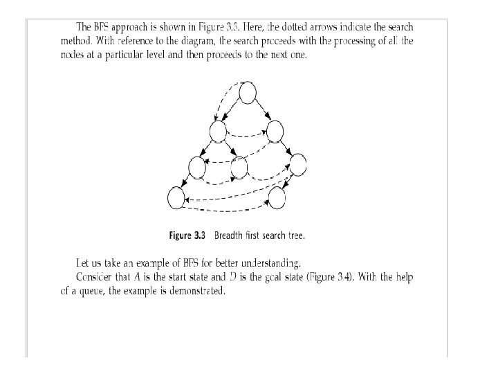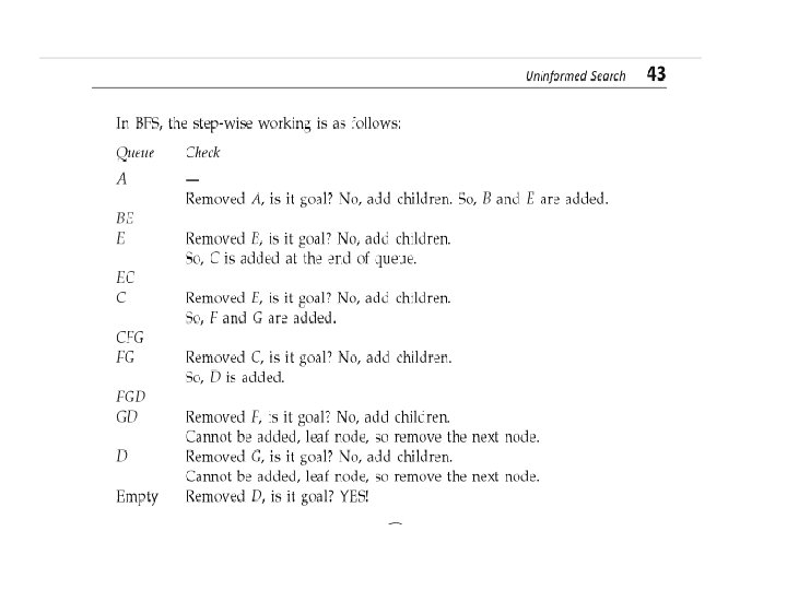 • From the example it is clear that each time you add a node , its children are to be added at the end of the queue as it proceeds level-wise • In the Ex. the goal state lies at the last level, each and every node or state is traversed and added to the queue