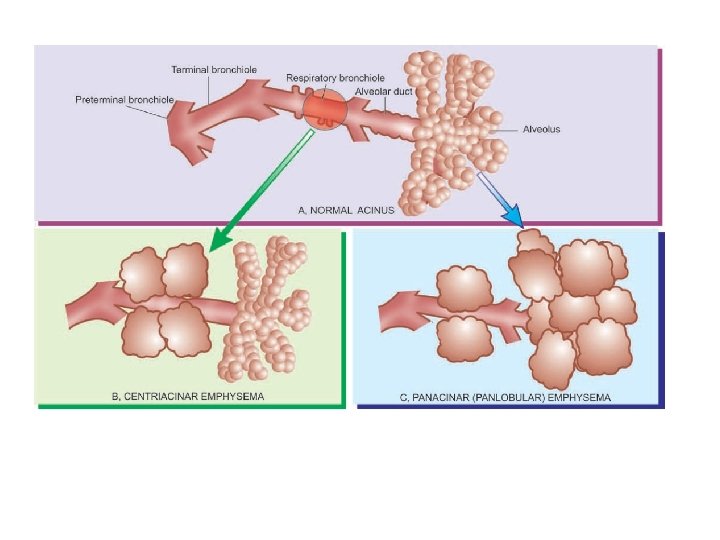EMPHYSEMA • combination of – permanent dilatation of air spaces distal to terminal bronchioles and – destruction of the walls of dilated air spaces • Emphysema is defined morphologically, while chronic bronchitis is defined clinically. – two conditions coexist frequently and – show considerable overlap -clinical features, • it is usual to label patients as ‘predominant emphysema’ and ‘predominant bronchitis’