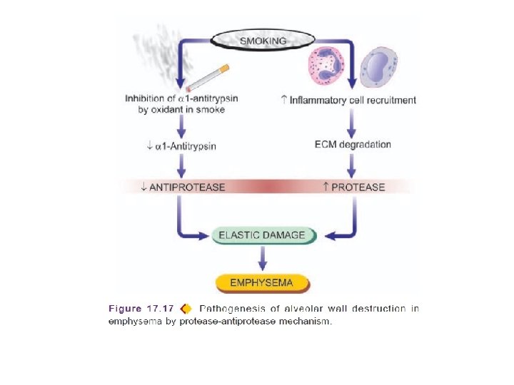 • Mechanism of alveolar wall destruction in emphysema by elastolytic action is due to imbalance between proteases (chiefly elastase) and anti-proteases (chiefly anti-elastase): • By decreased anti-elastase activity i. e. deficiency of α-1 antitrypsin. • By increased activity of elastase i. e. increased neutrophilic infiltration in lungs causing excessive neutrophil elastase. • Smoking promotes emphysema by both decreasing amount of antielastase as well as by increasing elastolytic protease in lungs. These are as under: • 1. Oxidant in cigarette smoke has inhibitory influence on α-1 antitrypsin, thus lowering the level of anti-elastase activity. • 2. Smokers have up to ten times more phagocytes and neutrophils in their lungs than nonsmokers; thus they have very high elastase activity.