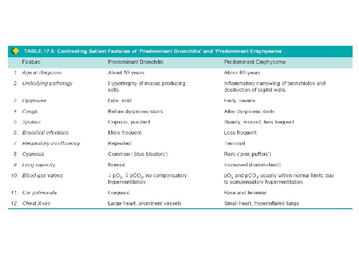 CLINICAL FEATURES • Considerable overlap of clinical features of chronic bronchitis and pulmonary emphysema (discussed below) as quite often the two coexist. • Contrasting features of ‘predominant emphysema’ and ‘predominant bronchitis’ are presented in Table 17. 5. • Important features of ‘predominant bronchitis’ are as under: 1. Persistent cough with copious expectoration of long duration 2. Recurrent respiratory infections are common 3. Dyspnoea is generally not prominent at rest but is more on exertion 4. cyanosis and oedema 5. Features of right heart failure (cor pulmonale) 6. Chest X-ray shows enlarged heart with prominent vessels