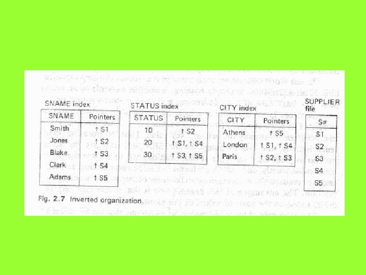 • • Just as it is possible to provide any number of lists in the multilist organization, it is also possible to provide any number of secondary indexes in an indexing organization. In the extreme case we have the situation illustrated in the figure on the next page, i. e. an index on every secondary field. This is known as inverted organization. Inverted organization will perform well for a request for all suppliers with a given property (say city or status or. . ), a request for all properties of a given supplier will take a long time to answer.
