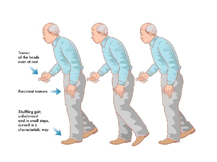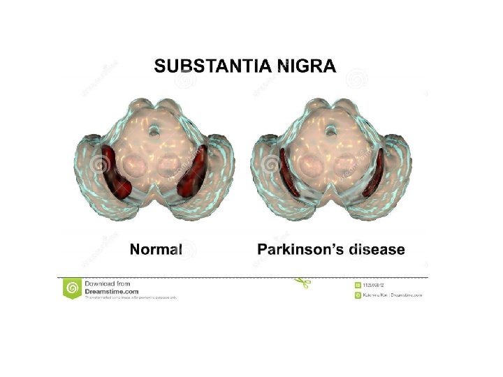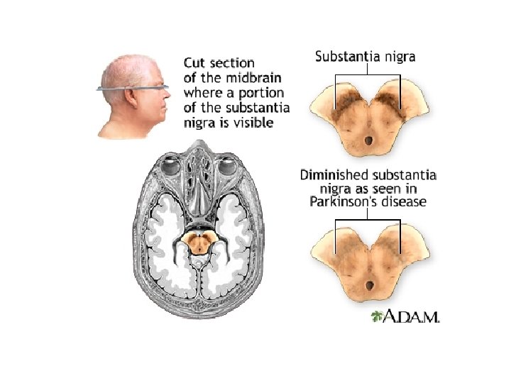 • As the disease worsens, non-motor symptoms become increasingly common. • Early symptoms, the most obvious are shaking, rigidity, slowness of movement, and difficulty with walking. • Late, thinking and behavioral problems, dementia, depression, anxiety • Sensory, sleep, and emotional problems • Cause: believed to involve both genetic and environmental factors • Motor symptoms of the disease result from death of cells in substantia nigra, a region of the midbrain – results in not enough dopamine in these areas • Diagnosis: based on symptoms • Cure: no cure