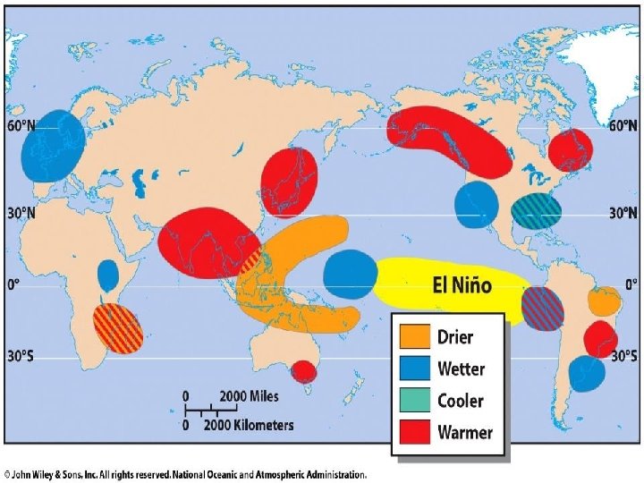 El Nino – Southern Oscillation (ENSO) – Trade winds normally blow warm water off the coast of South America and California (creates upwellings). – When winds fail, weaken, or change direction, the waters warm and stagnate. • Causes less productivity and possibly red tide. – As the Pacific surface temperature becomes warmer, global weather patterns are disrupted • First seen with wetter weather in eastern Pacific.