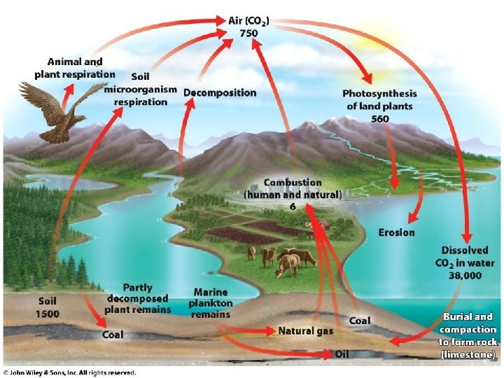 Nutrient Cycles – Carbon Cycle • Based on CO 2 cycling from animals to plants during respiration and photosynthesis. • Heavy deposits are stored in wetland soils, oceans, sedimentary rocks. – under right conditions, can become fossil fuels • Released by combustion and volcanic activity. • Returns to the soil from the atmosphere through rainfall – Carbonic Acid + H 20 = Rain with a p. H of ~5. 4
