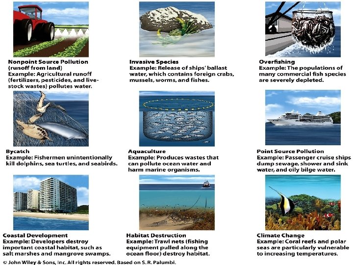 Ocean Pressures – ~40% of the world’s population lives within 100 km of a coast – Development has destroyed >50% of coastal wetlands and 1/3 of mangroves. – Fishing has damaged or destroyed habitats and severely decreased populations of fishes. – Global warming has had an immense impact on beach erosion and reef destruction.