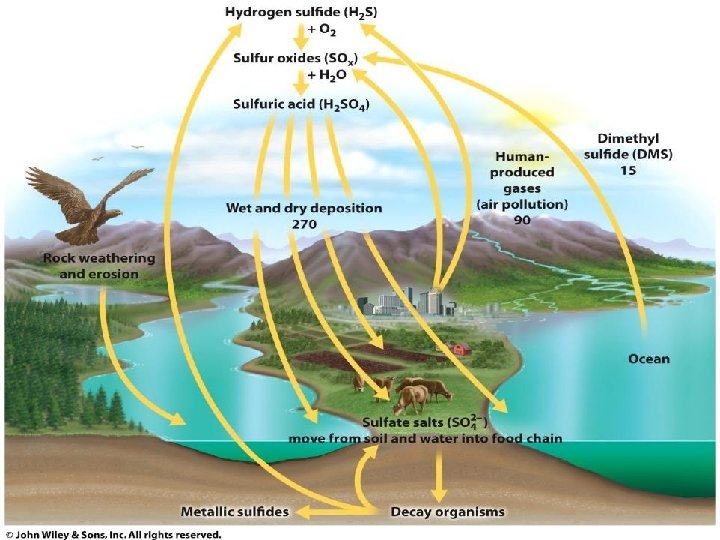 Nutrient Cycles – Sulfur Cycle • Most sulfur found in rocks, minerals, and ocean sediments. • Sulfur enters atmosphere through weathering, sea spray, and volcanic activity (H 2 S, SO 2).