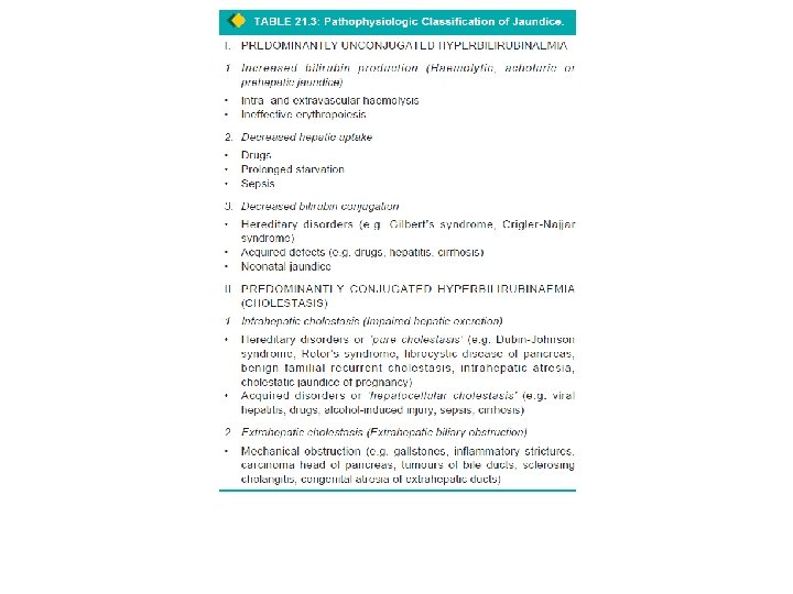 1. INTRAHEPATIC CHOLESTASIS • Intrahepatic cholestasis is due to impaired hepatic excretion of bile and may occur from hereditary or acquired disorders. i) Hereditary disorders • producing intrahepatic obstruction to biliary excretion are characterised by ‘pure cholestasis’ e. g. in Dubin-Johnson syndrome, Rotor syndrome, fibrocystic disease of pancreas and cholestatic jaundice of pregnancy. ii) Acquired disorders • intrahepatic excretory defect of bilirubin are largely due to hepatocellular diseases and hence are termed ‘hepatocellular cholestasis’ e. g. in viral hepatitis, alcoholic hepatitis, and druginduced cholestasis such as from administration of chlorpromazine and oral contraceptives.