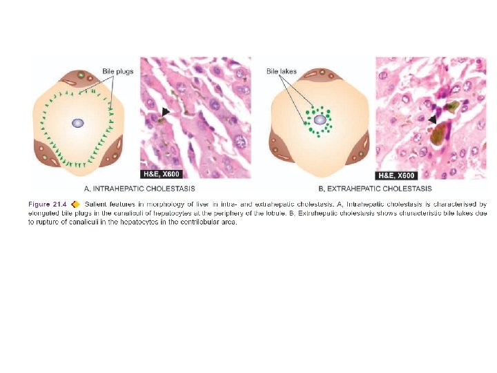 • Liver biopsy in cases with intrahepatic cholestasis reveals milder degree of cholestasis than the extrahepatic disorders • biliary canaliculi of the hepatocytes are dilated and contain characteristic elongated green-brown bile plugs (Figure). • The cytoplasm of the affected hepatocytes shows feathery degeneration. • Canalicular bile stasis eventually causes proliferation of intralobular ductules followed by periportal fibrosis and produces a picture resembling biliary cirrhosis 2. EXTRAHEPATIC CHOLESTASIS • Extrahepatic cholestasis results from mechanical obstruction to large bile ducts outside the liver or within the porta hepatis • common causes: gallstones, inflammatory strictures, carcinoma head of pancreas, tumours of bile duct, sclerosing cholangitis and congenital atresia of extrahepatic ducts • obstruction may be complete and sudden with eventual progressive obstructive jaundice, or • obstruction may be partial and incomplete resulting in intermittent jaundice.