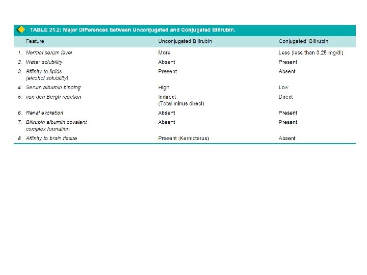 • 15 -20% of the bilirubin - non-haemoglobin haemcontaining pigments such as myoglobin, catalase and cytochromes. • haem -converted to biliverdin by microsomal haem oxygenase • Bilirubin from- biliverdin by biliverdin reductase 2. TRANSPORT OF BILIRUBIN • Bilirubin release from macrophages- circulates as unconjugated bilirubin in plasma bound to albumin. • sulfonamides and salicylates compete for albumin binding and displace bilirubin from albumin, • facilitating bilirubin to enter into brain in neonates and increase risk of kernicterus. • Bilirubin found in body fluids- proportion to their albumin content - CSF, joint effusions, cysts