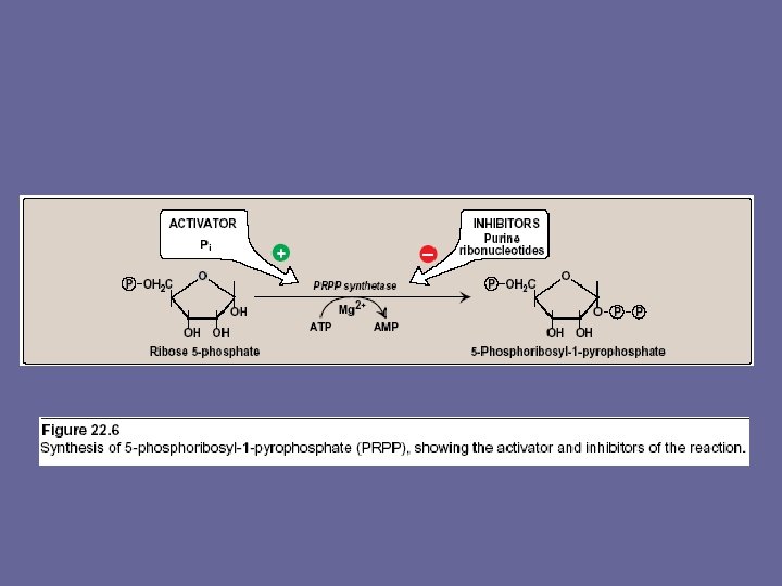 A. Synthesis of 5 -phosphoribosyl-1 -pyrophosphate (PRPP) – PRPP is an “activated pentose”, participates in synthesis of purines and pyrimidines, and in salvage of purine bases – Synthesis of PRPP from ATP and ribose-5 -P is catalyzed by PRPP synthetase (ribose phosphate pyrophosphokinase). – The enz. is activated by (Pi) and inhibited by purine nucleotides (end-product) – Sugar in PRPP is ribose, so end products of de novo purine synthesis ribonucleotides, when deoxyribonucleotides needed for DNA syhtnesis, ribose is reduced