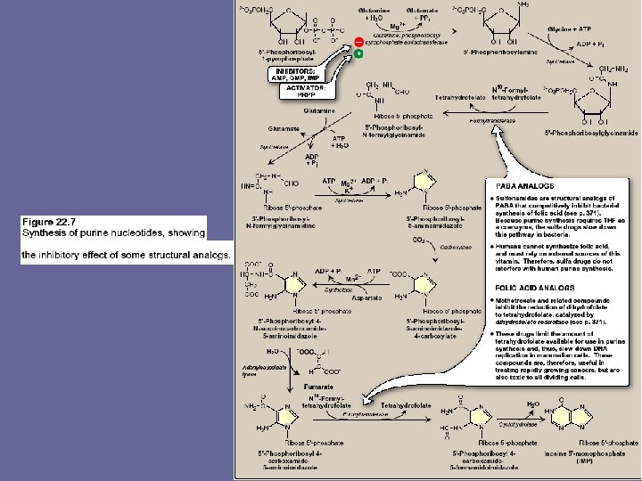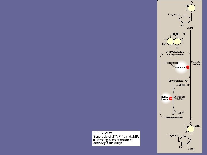 • DHF can be reduced to THF by dihydrofolate reductase, an enzyme that is inhibited in the presence of drugs such as methotrexate. • By decreasing the supply of THF, these folate analogs not only inhibit purine synthesis, but, by preventing methylation of d. UMP to d. TMP, they also lower the cellular concentration of this essential component of DNA synthesis is inhibited and cell growth slowed. • Drugs such as those described above, therefore, are used to decrease the growth rate of cancer cells.