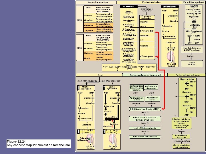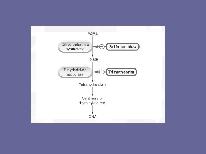 D. Synthetic inhibitors of purine synthesis • Sulfonamides inhibit growth of rapidly dividing m/o’s without interfering with human cell functions. • Methotrexate (structural analog of folic acid) used to control spread of cancer by interfering with synthesis of nucleotides (thus DNA, RNA). – Inhibitors of human purine synthesis are extremely toxic to tissues, esp. to developing structures such as in a fetus , or to cell types that replicate rapidly, including those of BM, skin, GI tract, immune system, or hair follicles. – Individuals taking such anti-cancer drugs experience adverse effects e. g. , anemia, scaly skin, GI tract disturbance, immunodeficiencies, and baldness • Trimethoprim (another folate analog) has antibacterial activity as it selectively inhibits bacterial dihydrofolate reductase.