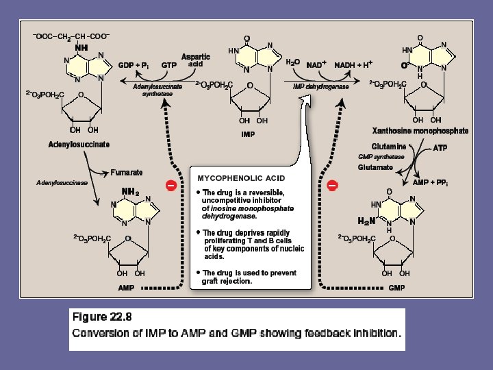E. Conversion of IMP to AMP and GMP • This requires a 2 -step energy requiring pathway • Synthesis of AMP requires GTP and that of GMP requires ATP • The 1 st rxn in each pathway is inhibited by the end product. This diverts IMP to the synthesis of the purine species present in lesser amounts. • If both AMP and GMP present in adequate amounts, de novo pathway of purine synthesis is turned off at amidotransferase step. • Mycophenolic acid (MPA) is a potent, reversible, uncompetitive inhibitor of inosine monophosphate dehydrogenase in use for preventing graft rejection. Blocks de novo formation of GMP, thus depriving rapidly proliferating cells, icluding T and B cells of a key component of nucleic acids