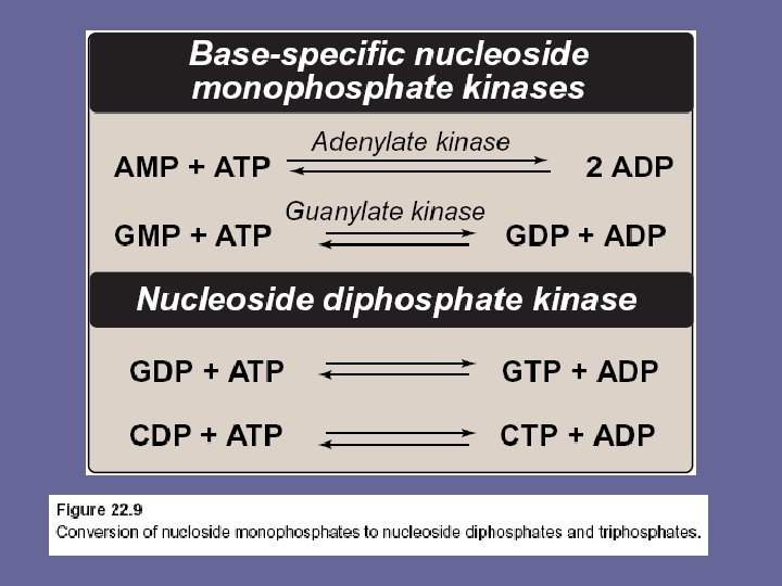 F. Conversion of nucleoside monophosphates (NMPs) to nucleoside diphosphates (NDPs) and triphosphates (NTPs) • NDPs are synthesized from NMPs by base-specific nucleoside monophosphate kinases. These kinases do not discriminate b/w ribose or deoxyribose in the substrate. • ATP is generally the source of transferred phosphate as it is the abundant NTP • Adenylate kinase is particularly active in liver and muscle, where turnover of energy from ATP is high. Its function is to maintainan equilibrium among AMP, ADP and ATP • NDPs and NTPs are interconverted by nucleoside diphosphate kinase, an enz. with broad specificity.