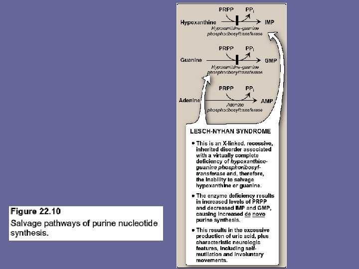 G. Salvage pathway of purines • Purines from normal turnover of cellular nucleic acids, or obtained from diet and not degraded, can be reconverted into NTPs and used by the body. This is “salvage pathway” of purines. 1. Conversion of purine bases to nucleotides: - Two enz’s are involved: adenine phosphoribosyltransferase (APRT) and hypoxanthine-guanine phosphoribosyltransferase (HPRT). - Both enz’s use PRPP as source of ribose 5 -p. Release of ppi makes these rxns irreversible.