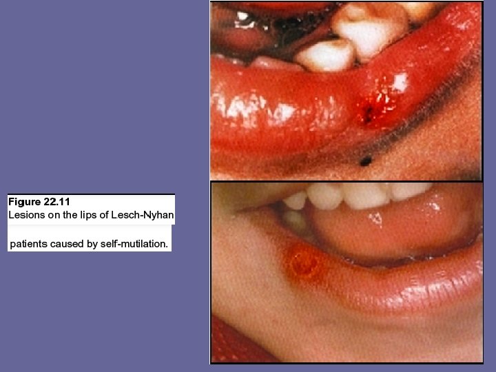 2. Lesch-Nyhan syndrome: • X-linked, recessive disorder, associated with virtually complete deficiency of HPRT. • Inability to salvage hypoxanthine or guanine, from which excessive amounts of uric acid are produced. • In addition, lack of salvage pathway causes increased PRPP levels and decreased IMP and GMP levels. • So, glutamine: phosphoribosylpyrophosphate amidotransferase has excess substrate and decreased inhibitors available, and de novo purine synthesis increased. • Decreased purine reutilization and increased purine synthesis results in production of large amounts of uric acid, making Lesch. Nyhan syndrome a severe, heritable form of gout. • Patients with Lesch-Nyhan syndrome tend to produce urate kidney stones. • In addition, characteristic neurologic features of the disorder include self-mutilation and involuntary movements.