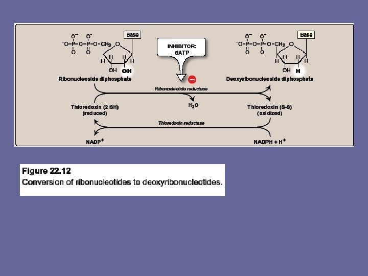 IV. Synthesis of Deoxyribonucleotides A. Ribonucleotide reductase (ribonucleoside diphosphate reductase) - Is a multisubunit enzyme (2 B 1 + 2 B 2) specific for reduction of nucleoside diphosphates (ADP, GDP, CDP, UDP) to their deoxy forms. The immediate donors of hydrogen atoms needed for reduction of 2`-OH are two –SH groups on enz itself, which during rxn form a disulfide bond.