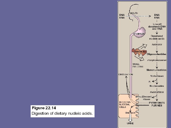A. Degradation of dietary nucleic acids in the small intestine • Ribonucleases and deoxyribonucleases, secreted by the pancreas, hydrolyze RNA and DNA primarily to oligonucleotides. • Oligonucleotides are further hydrolyzed by pancreatic phosphodiesterases, producing a mixture of 3′- and 5′mononucleotides. • A family of nucleotidases removes the phosphate groups hydrolytically, releasing nucleosides that may be absorbed by the intestinal mucosal cells, or be further degraded to free bases before uptake. • Dietary purines and pyrimidines are not used to a large extent for the synthesis of tissue nucleic acids. Instead, the dietary purines are generally converted to uric acid by intestinal mucosal cells. • Most of the uric acid enters the blood, and is eventually excreted in the urine.